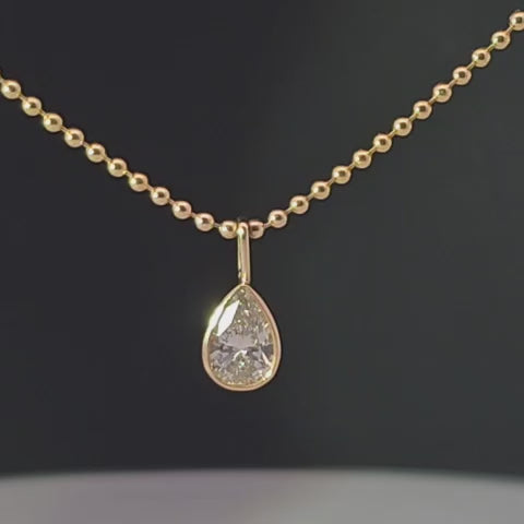 The Lumi Pear Necklace embodies light, elegance, and quiet luxury. A 0.75ct pear-shaped lab-grown diamond is set in a handcrafted 14K gold bezel—its brilliance catching every movement with ease. Suspended from a refined 1.5mm bead chain in a 20” length, this necklace radiates sophistication and confidence.